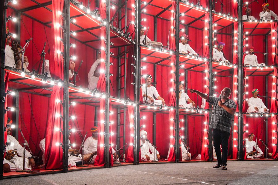 Directed by Roysten Abel, this grand ensemble of 40+ Rajasthani musicians offers a mesmerizing auditory and visual experience. Performers occupy glowing pods stacked in a four-story structure, their music intensifying as more pods light up. A powerful synthesis of sound and spectacle, this performance is an unforgettable celebration of Rajasthan’s musical heritage.